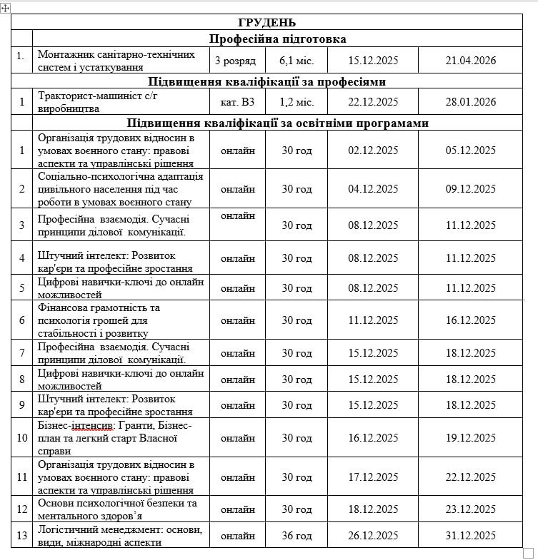 Орієнтовний графік організації професійного навчання у грудні 2025 року