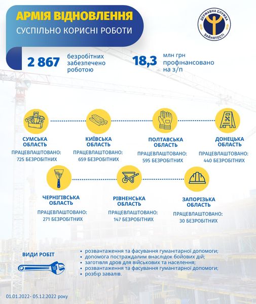 Усе більше українців, котрі з різних причин залишилися в період воєнних дій без роботи, залучаються до "Армії відновлення" через виконання суспільно важливих робіт з відбудови країни.