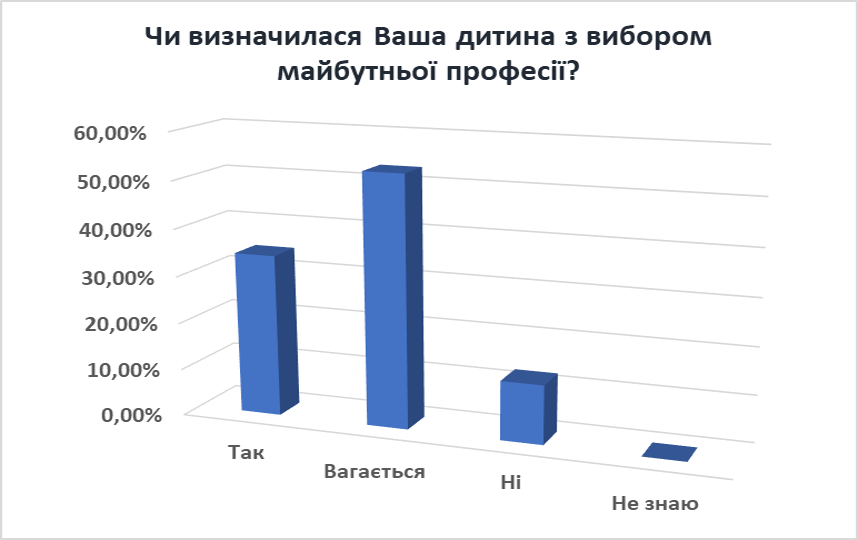 Водночас з майбутньою професією, на думку батьків, визначилися 34,4% учнів, вагаються з вибором 53,1%, зовсім не знають, де продовжити вишкіл – 12,5%.