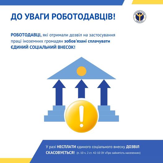 Звертаємо вашу увагу! Роботодавці, які отримали дозвіл на застосування праці іноземних громадян,зобов'язані сплачувати єдиний соціальний внесок. Дозвіл на застосування праці іноземців або осіб без громадянства скасовується у разі несплати єдиного внеску на загальнообов’язкове державне соціальне страхування за особу, на застосування праці якої отримано такий дозвіл https://bit.ly/3LDpMby