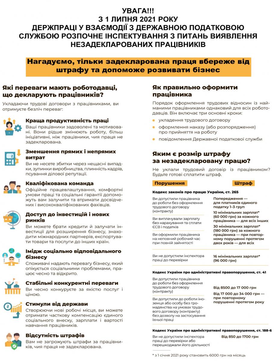 З 1 липня на всій території України стартувала інспекційна кампанія з питань виявлення неоформлених трудових відносин, до якої залучені Державна служба України з питань праці, Державна податкова служба України, Національна поліція України, Державна служба України з безпеки на транспорті, Державна служба України з лікарських засобів та контролю за наркотиками, Державна міграційна служба та органи місцевого самоврядування.
