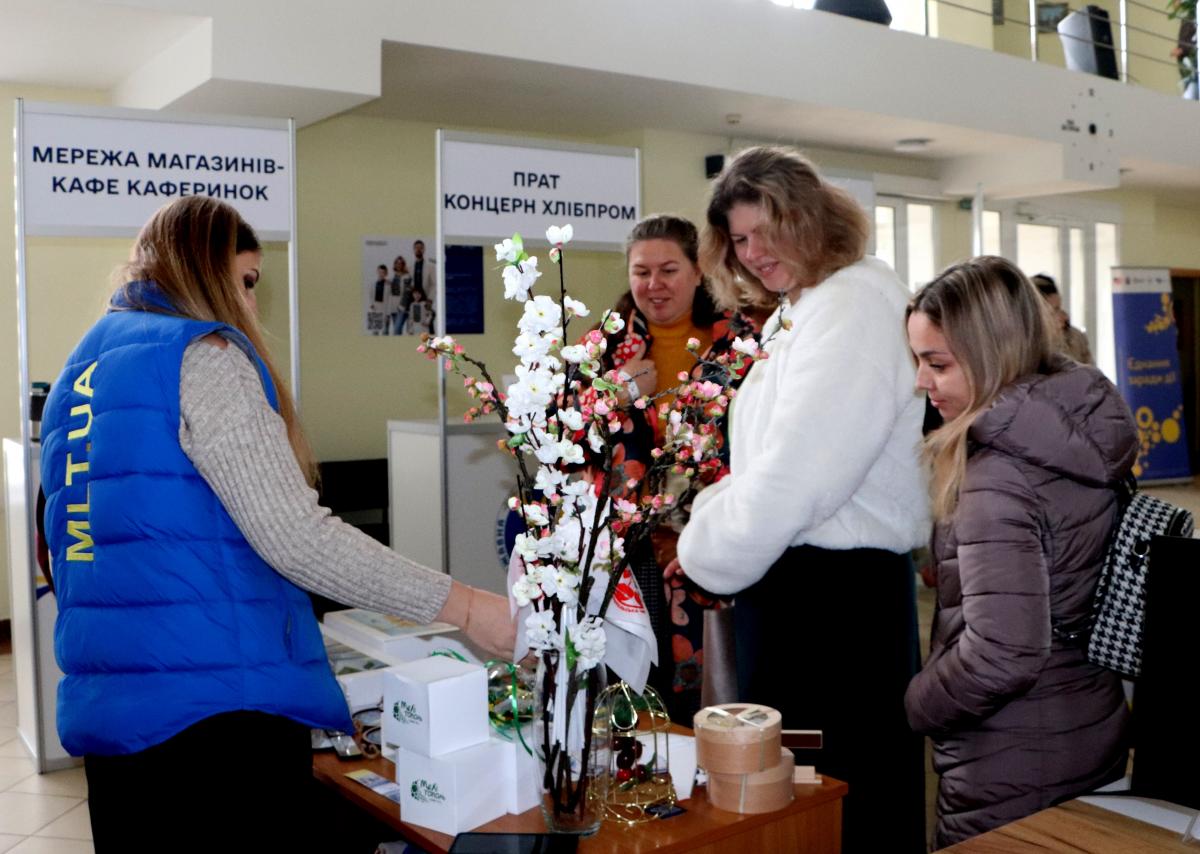 За окремими столиками вимушено переміщені особи – учасники грантової програми «Власна справа» – охоче розповідали присутнім про свій шлях у бізнес, презентували власні вироби чи послуги, проводили майстер-класи та ділилися досвідом.