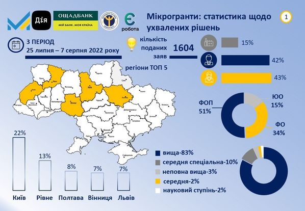 За результатами ІІІ періоду (з 24 липня по 7 серпня) реалізації державної програми “єРобота” щодо отримання мікрогранту на створення або розвиток бізнесу подано 1604 заяви.Серед лідерів - Київ, Дніпро, Львів, Полтава та Одеса.