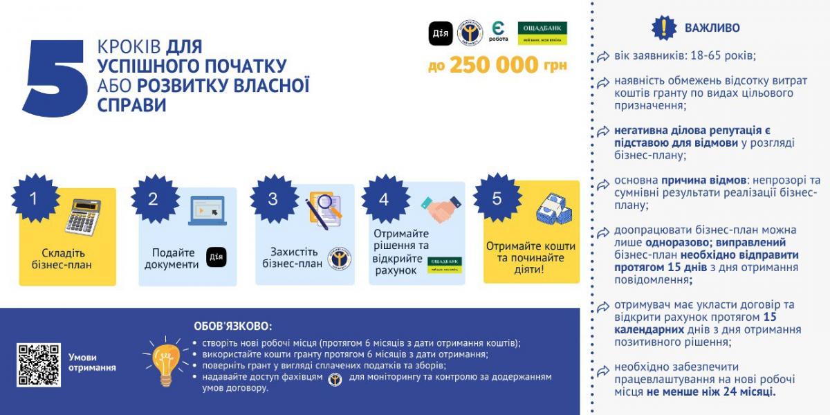 Нагадаємо, що грант на власну справу стартував 01 липня 2022 року та є однією з програм “єРобота”. За цією програмою можна отримати мікрогрант на старт або розвиток бізнесу від 50 до 250 тис грн. Обов'язковою умовою є створення 1-2 нових робочих місць залежно від суми мікрогранту.