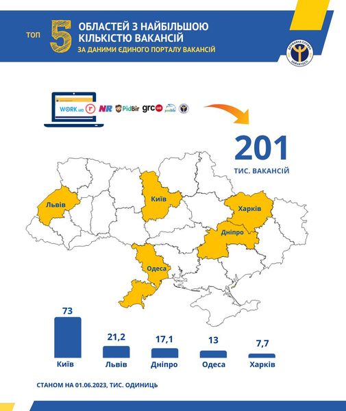 Цифра дня: станом на 1 червня 2023 року на "Єдиному порталі вакансій" налічується понад 200 тисяч пропозицій роботи .