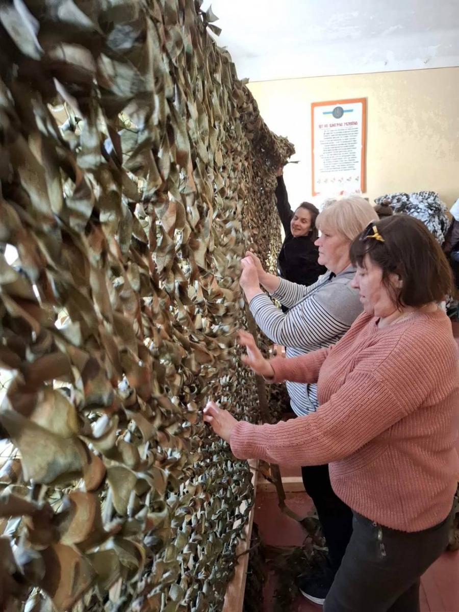 У Стрийській ТГ робота кипить щодня. Завдяки співпраці служби зайнятості та КУ Стрийської міської ради «Будинок воїна», БФ «Фонд громад «РІДНЯ», БО «Благодійний фонд Олени Скоблик» безробітні мешканці громади долучилися до суспільно корисних робіт та виготовляють маскувальні сітки - «невидимки» для прикриття військової техніки та позицій. Це кропітка праця: потрібно правильно "під сезон" підібрати кольори , нарізати тканину та вплести її так, щоб створити ілюзію природного ландшафту.