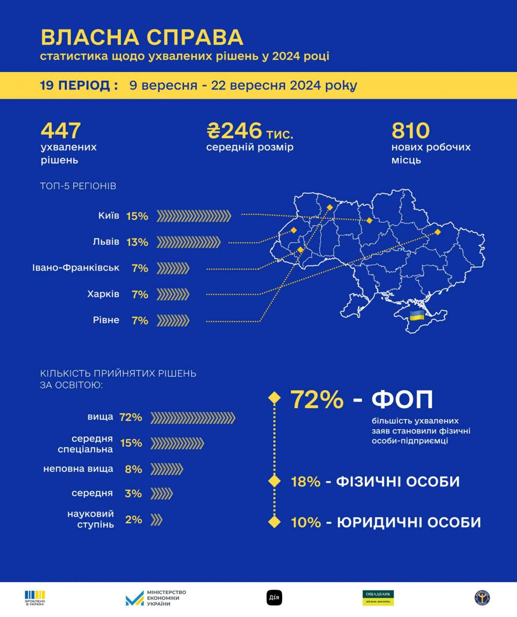 Ухвалені чергові рішення за урядовими програмами «Власна справа» та «Грант для ветеранів та їх подружжя», які подавали заяви на отримання мікрогрантів у період з 09 вересня по 22 вересня 2024 року з урахуванням доопрацьованих заяв, поданих у попередні періоди. Файл з переліком номерів заяв, які набрали найбільшу сукупну кількість балів за програмою «Власна справа», можна завантажити тут.