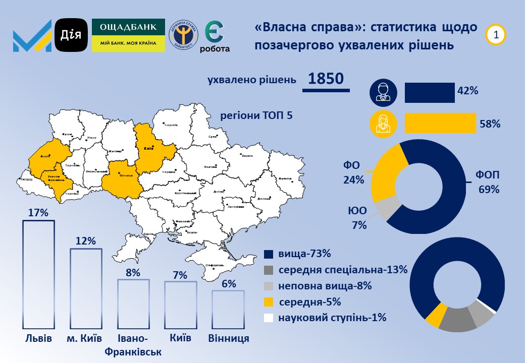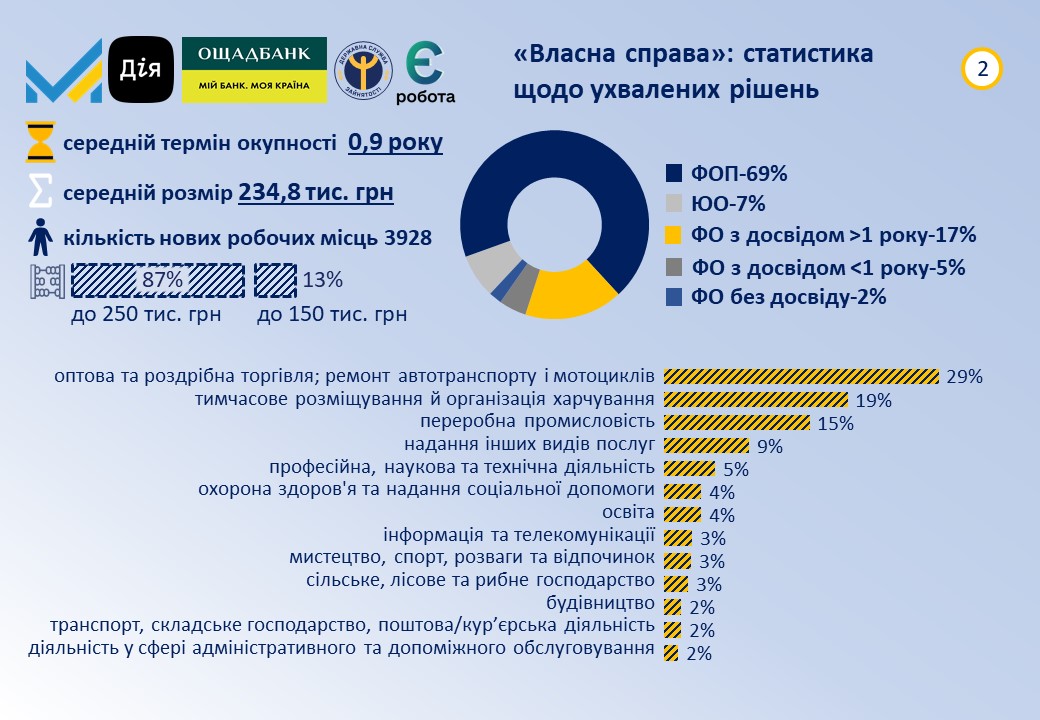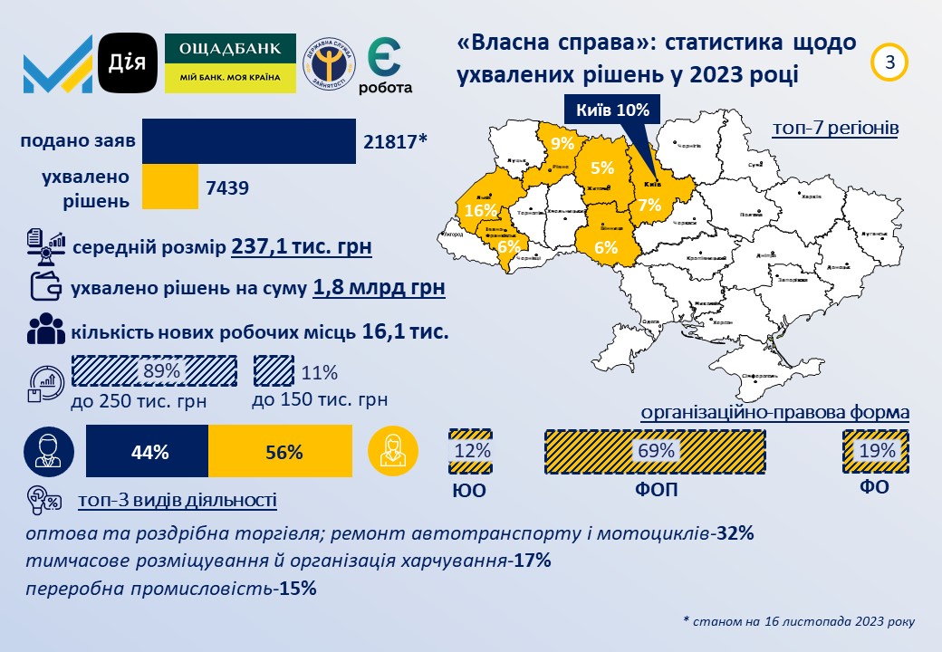 За результатами розгляду було ухвалено 1850 рішень на загальну суму майже 435 млн грн. Передбачається, що отримувачі створять 3928 нових робочих місць. Серед регіонів з найбільшою кількостю погоджених заяв в лідерах Львівська (17%), м. Київ (12%), Івано-Франківська (8%), Київська (7%) та Вінницька області (6%). Переможці здійснюють або планують розпочати свою господарську діяльність переважно в таких видах діяльності: гуртова/роздрібна торгівля та ремонт автотранспорту (29%), тимчасове розміщення й організація харчування (19%), переробна промисловість (15%), надання інших видів послуг (9%), професійна наукова та технічна діяльність (5%), охорона здоров'я та надання соціальної допомоги (4%). Більше 76% отримувачів вже мають працюючий бізнес, із них фізичні особи-підприємці складають майже 69%, а юридичні особи - 8%. 58% фізичних осіб та ФОП становлять жінки. Мають досвід роботи більше 1 року - 71% фізичних осіб, до 1 року - 20%. Майже 73% отримувачів мають вищу освіту, 13% - середню спеціальну (технікум, коледж). Всього, з початку року вже ухвалено більше 7,4 тисяч рішень на суму понад 1,8 млрд грн, що передбачає створення більше 16 тисяч нових робочих місць.