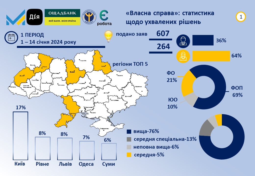 Ухвалені рішення за урядовими програмами "Власна справа" та "Грант для ветеранів та їх подружжя" щодо заявників, котрі подали документи на отримання коштів у період з 1 до 14 січня 2024 року з урахуванням доопрацьованих заяв, які надійшли у попередні періоди.