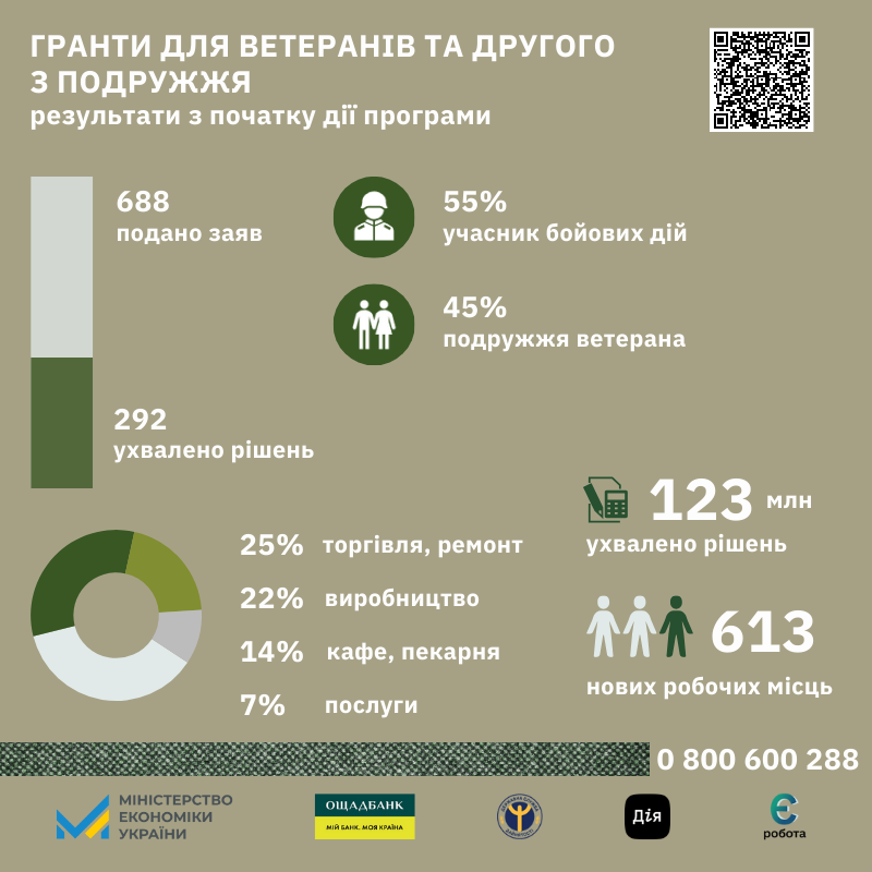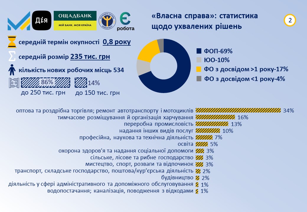За результатами розгляду заяв ухвалено 359 позитивних рішень на загальну суму майже 62 млн грн. Передбачається, що отримувачі створять 534 нове робоче місце. Серед регіонів з найбільшою кількостю схвалених заявок цього разу в лідерах м. Київ (11%), Рівненська та Львівська (11%), Одеська (7%) та Київська області (6%). В основному переможці  ведуть або планують розпочати  господарську діяльність у таких сферах економіки як гуртова/роздрібна торгівля та ремонт автотранспорту (34%), тимчасове розміщення й організація харчування (16%), переробна промисловість (13%), надання інших видів послуг (10%), професійна, наукова та технічна діяльність (7%). Понад 79% отримувачів - бізнесмени з досвідом, з них фізичні особи-підприємці складають більш як 69%, а юридичні особи - 10%. Майже 64% фізичних осіб та ФОП становлять жінки. Мають досвід роботи понад рік 82% фізичних осіб, до року - більш як 16%. Понад 76% грантоотримувачів з вищою освітою, 13% - середньою спеціальною (технікум, коледж). Детальна статистика за згаданий період подання заяв, а також від початку року зазначена у інфографіці, що розташована нижче.