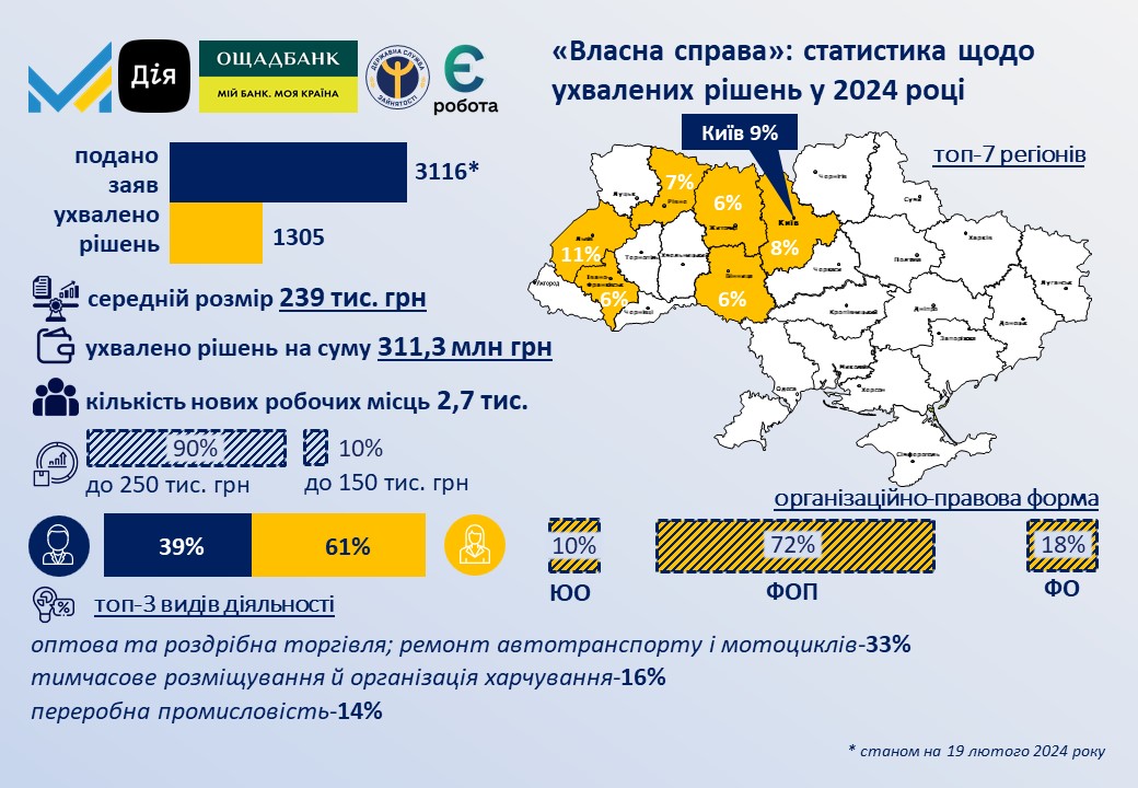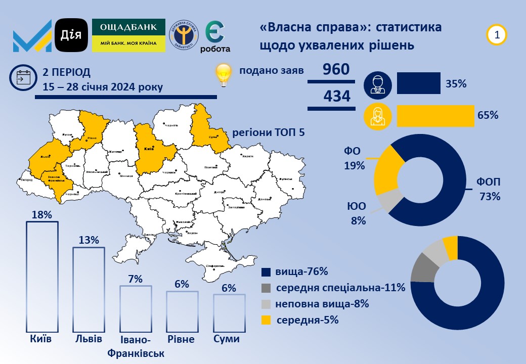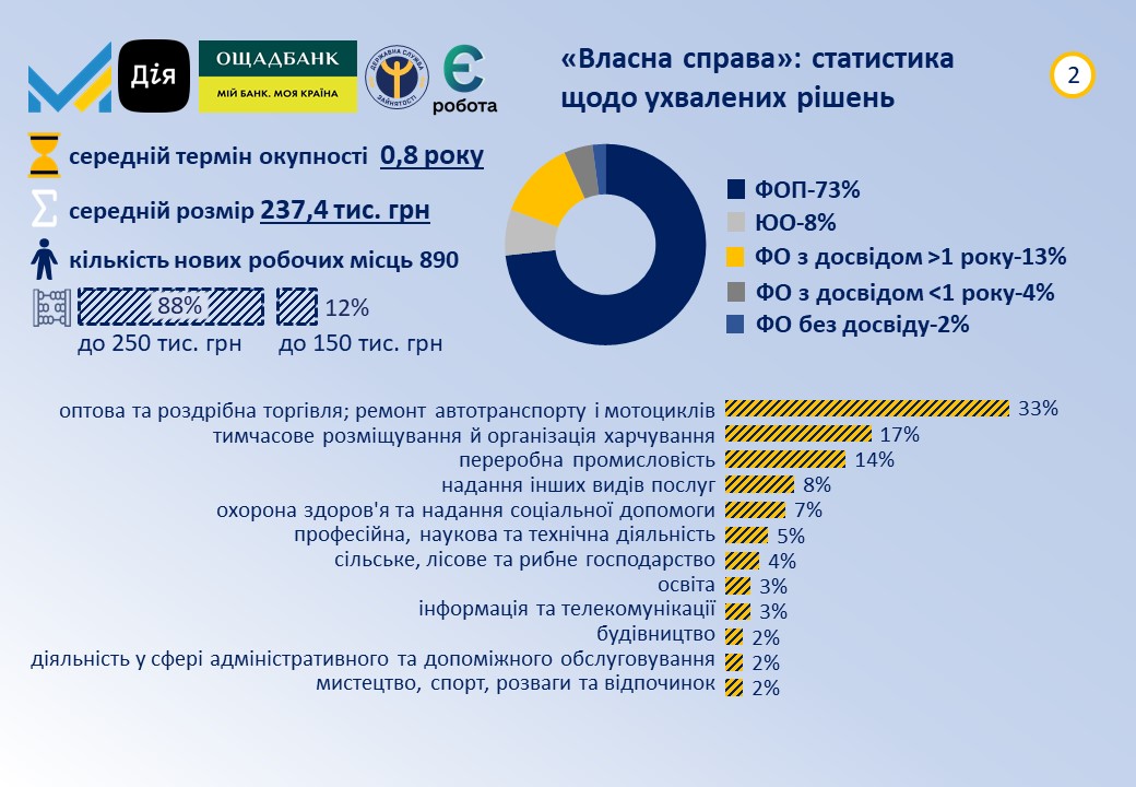 За результатами розгляду заяв було ухвалено 434 позитивних рішень на загальну суму більше 103 млн грн. Передбачається, що отримувачі створять 890 нових робочих місць. Серед регіонів з найбільшою кількостю схвалених заявок у цього разу в лідерах Львівська область (13%), м. Київ (10%), Київська (8%), Івано-Франківська (6%) та Рівненська (6%) області. Переможці здійснюють або планують розпочати свою господарську діяльність переважно в таких видах діяльності: гуртова/роздрібна торгівля та ремонт автотранспорту (33%), тимчасове розміщення й організація харчування (17%), переробна промисловість (14%), надання інших видів послуг (8%), охорона здоров'я та надання соціальної допомоги (7%). Майже 81% отримувачів вже мають діючий бізнес, із них фізичні особи-підприємці складають трохи більше 73%, а юридичні особи - 7%. Більше 61% фізичних осіб та ФОП становлять жінки. Мають досвід роботи у напрямі реалізації власної справи: більше 1 року - більше 65% фізичних осіб, до 1 року - майже 24%. Більше 74% отримувачів мають вищу освіту, 11% - середню спеціальну (технікум, коледж). Детальна статистика за даний період подання заяв, а також з початку року зазначена у нашій інфографіці, розташованій нижче.