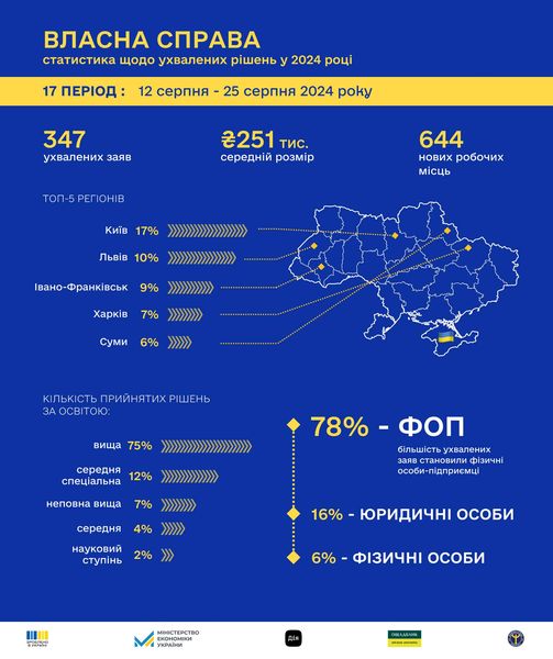 78% отримувачів вже має діючий бізнес, а 63% фізичних осіб та ФОП становлять жінки. Більшість отримувачів — 75% мають вищу освіту, а 12% — середню спеціальну (технікум, коледж).