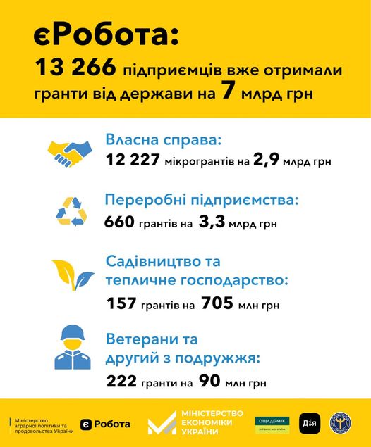 Загалом гранти на започаткування або розширення власної справи отримали понад 13 тисяч українців. Отримувачі грантів створять понад 40 тисяч нових робочих місць для українців.