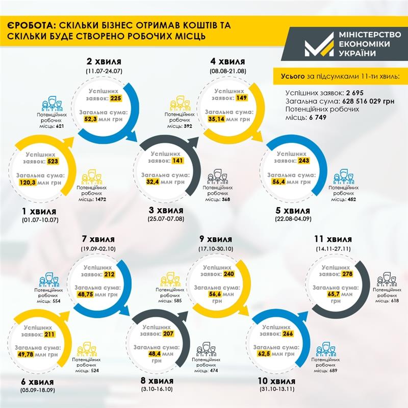 У рамках одинадцятої хвилі реалізації урядової ініціативи «єРобота» 278 підприємців отримають мікрогранти на загальну суму 65,6 млн грн і створять 618 нових робочих місць. Про це повідомила Перший віцепрем'єр-міністр - Міністр економіки України Юлія Свириденко.