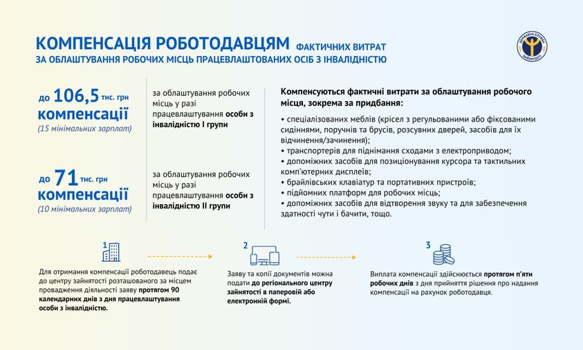 Відтак, роботодавець, який надав роботу людині  з першою або другою групою інвалідності та підлаштував під її потреби робоче місце,  може  отримати грошову компенсацію у сумі, що не перебільшує 106,5 тис. грн - за осіб з інвалідністю І групи та до 71 тис. грн - за облаштування робочих місць для людей з інвалідністю ІІ групи.
