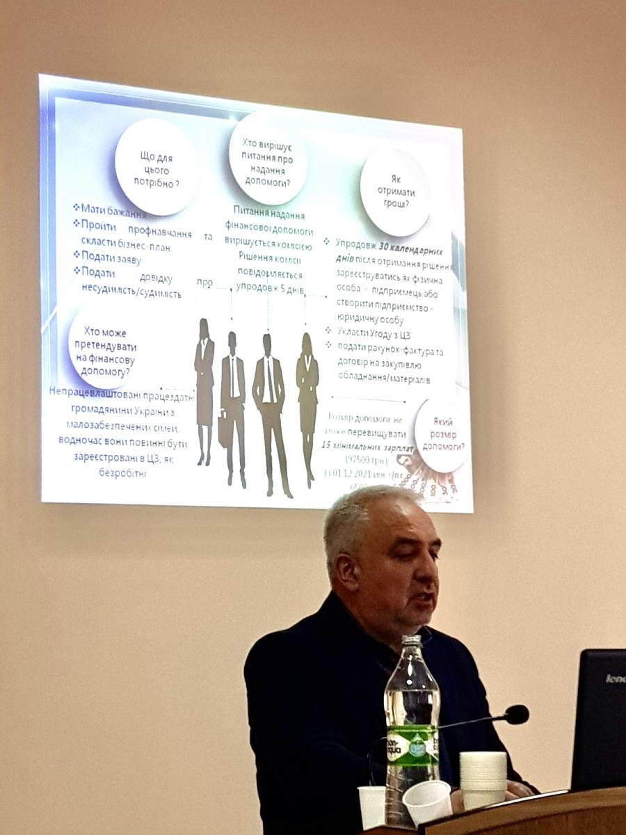 Окремо В. Барилюк презентував присутнім освітні послуги Львівського ЦПТО ДСЗ, навчального закладу, основне завдання якого – професійний вишкіл дорослого населення. Сьогодні навчання ведеться за 16 ліцензійними професіями і понад 20 напрямами. Центр професійно-технічної освіти навчає як безробітних, так і інших охочих змінити фах або підвищити кваліфікацію коштом фізичних або юридичних осіб. Зацікавила учасників семінару інформація про аспекти видачі ваучерів на навчання. Проте регламент зустрічі не дозволив всебічно обговорити деякі питання. Як зазначив директор ЛОЦЗ, будь-хто у разі звернення до центрів зайнятості або філій обласної служби зайнятості може отримати вичерпні консультації, фахові поради та рекомендації з питань, що входять до компетенції служби зайнятості.