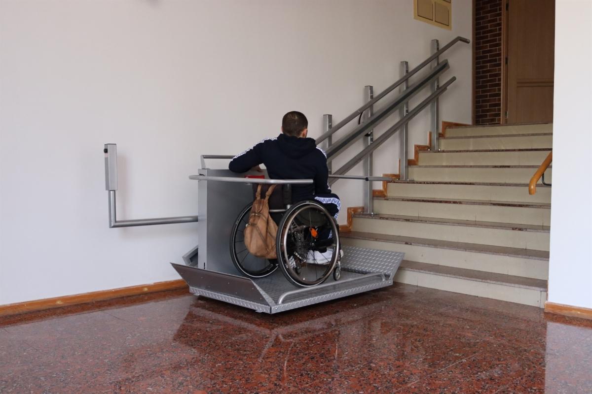 Комфортність цієї похилої підіймальної платформи у тому, що людина може нею скористатися без сторонньої допомоги.